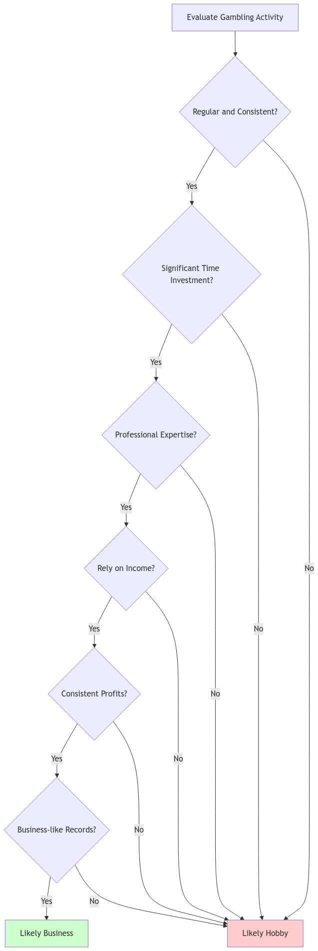 - Operation in a business-like manner: Do you maintain detailed records, employ strategies, and treat gambling as a professional endeavor?
