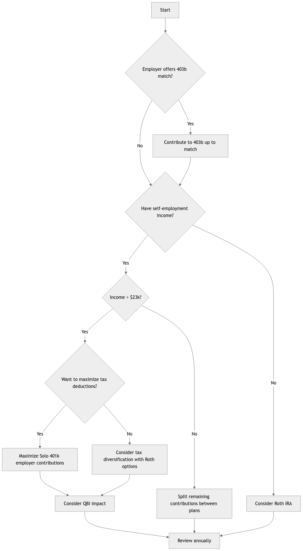 Strategically allocating contributions between your 403(b) and Solo 401(k) can help you optimize your QBI deduction while still maximizing your retirement savings. Keep in mind that certain high-income thresholds can affect the QBI deduction, with phase-out rules applying to those with higher incomes.