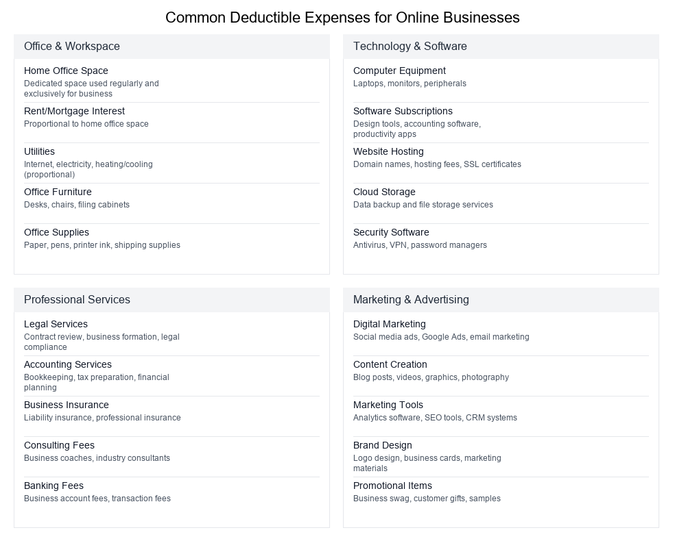 As an online business owner, you can deduct a variety of expenses to reduce your taxable income. Accurate record-keeping is crucial to maximize these deductions.